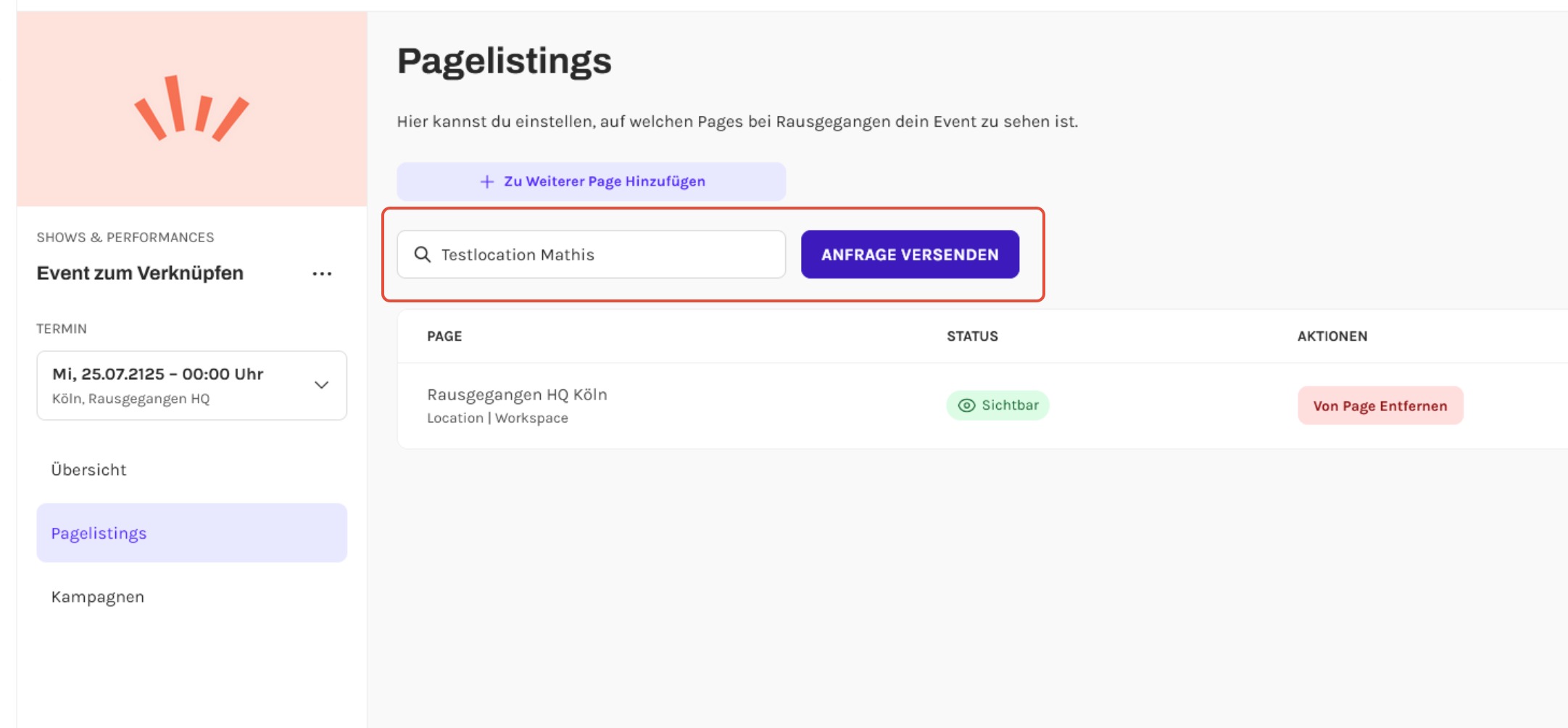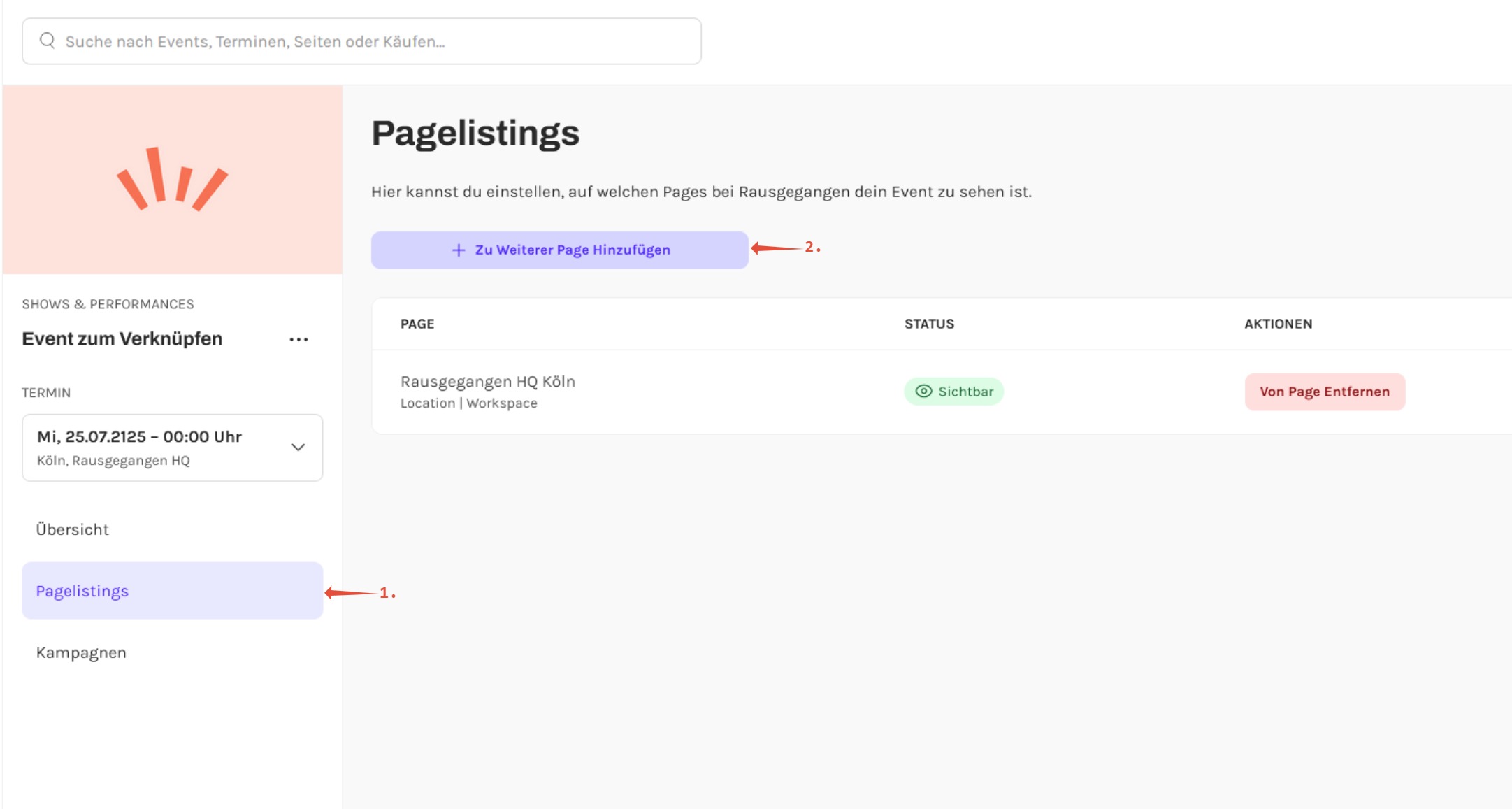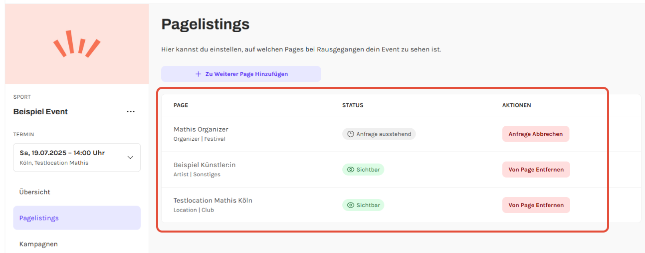 - Eine Übersicht aller Pages, auf denen dein Event bereits gelistet ist