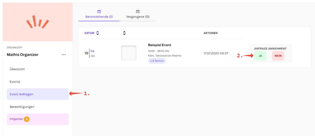 Wenn du die angefragte Page selbst verwaltest, kannst du die Anfrage einfach in dem Reiter "Event Anfragen"(1.) deiner Page bestätigen(2.).