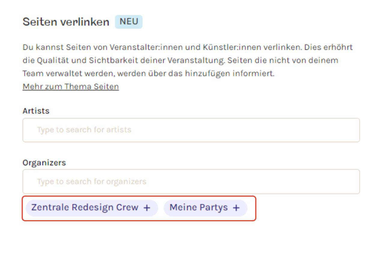 Im Anlegeprozess kannst du im 3. Schritt „Inhalte“ dein Event direkt mit deiner Artist- oder Organizer-Page verknüpfen. Über die Schnellauswahl werden dir bis zu 6 Pages angezeigt, die du in deinem Team verwaltest. Wähle hier die passenden Pages direkt aus.
