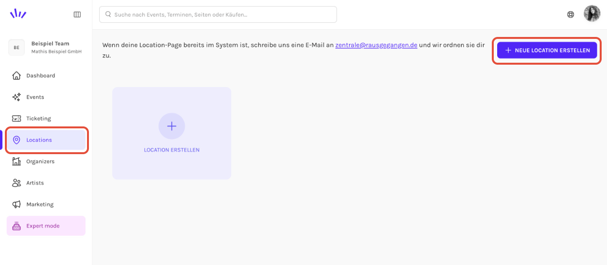 Du kannst auf "Locations" und dann auf den Button "+ Neue Location erstellen" klicken, um eine Page zu erstellen.
