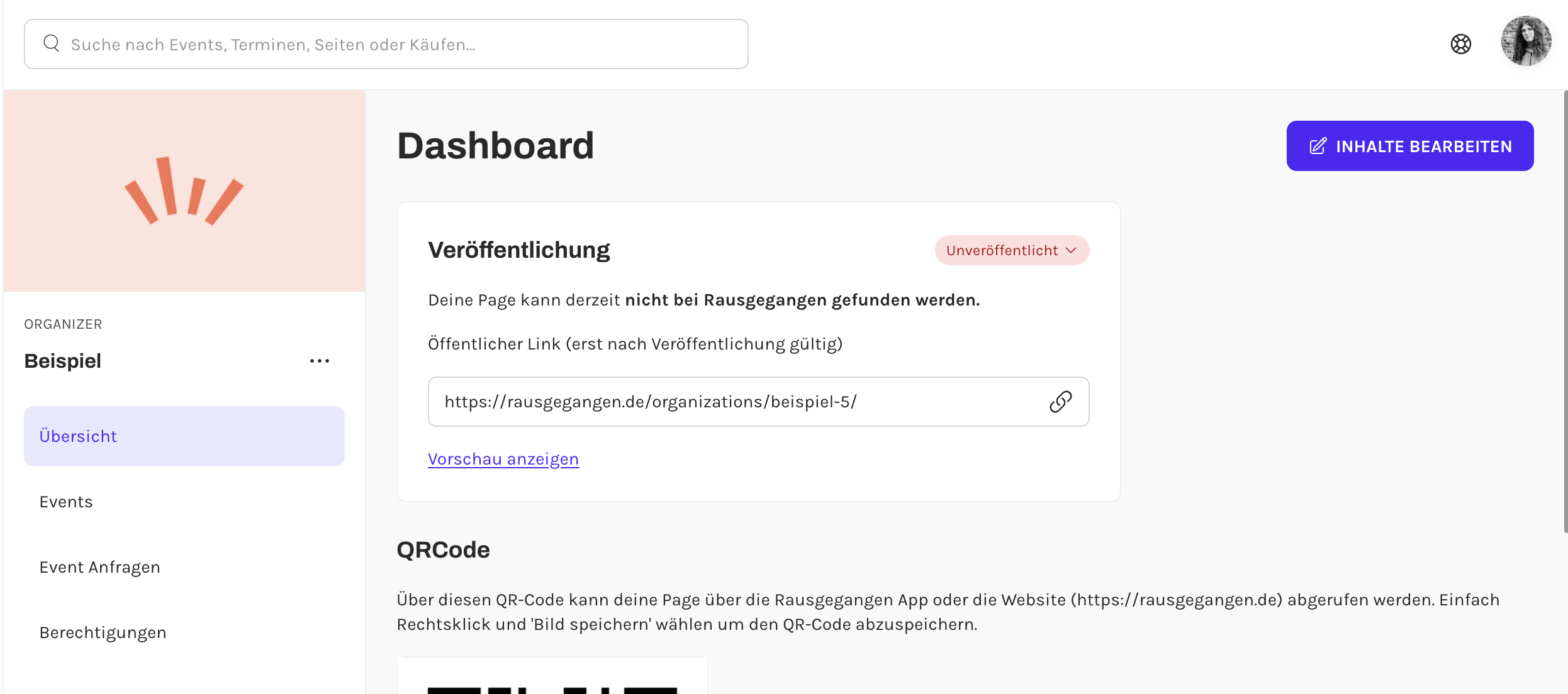 Wenn du die Veröffentlichung anfragen möchtest kannst du auf diesem Link lesen, wie das geht: Wie veröffentliche ich meine Page auf Rausgegangen?